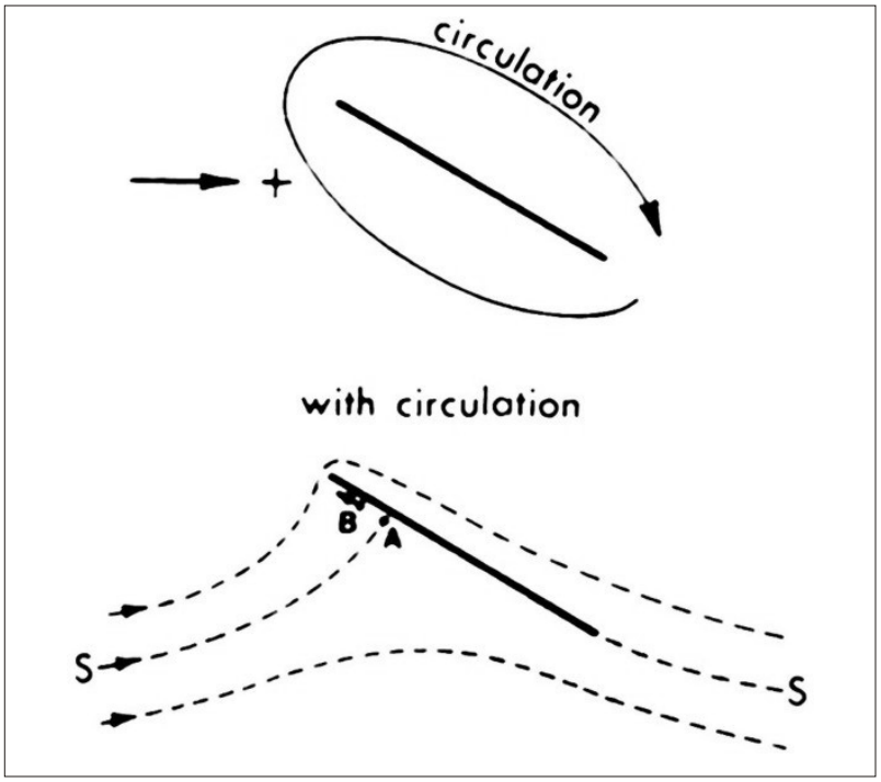 In Figure 3, we observe the airflow around a flat plate without circulation. The streamlines bend around the object, but there's no mechanism to ensure smooth airflow exit at the trailing edge, thus failing to satisfy the Kutta condition, which is crucial for efficient lift generation. The Kutta condition requires that air exits the sail's trailing edge smoothly, with equal velocities and pressures on both sides to facilitate lift [2].